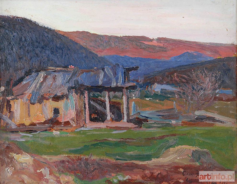 olej, tektura 25 x 32 cm; sygn. p. d.: Oleks.Nowakiwskij / Osmołóda 9/XII 1909 (cyrylicą) stempel artysty cyrylicą N w kole; sygn. l. d.: A. N (w kole); obok nieczytelny, częściowo zamalowany napis cyrylicą na odwrocie odręczny napis: Refleks o zachodzie słońca Osmołóda (ołówkiem) Aleksander NOWAKOWSKI - Oleksa NOWAKIWSKIJ (1872 - 1935)