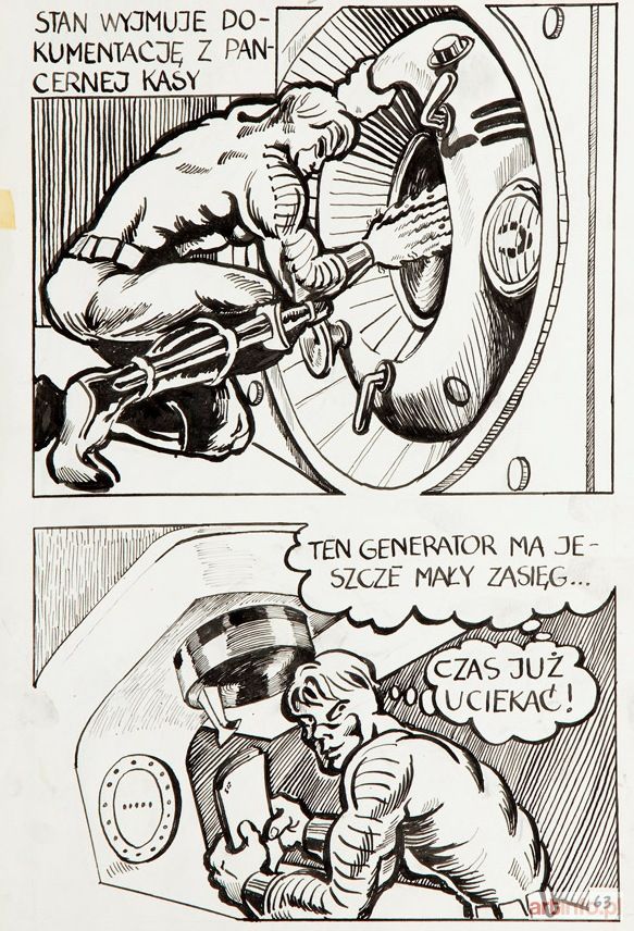 plansza komiksowa nr 63 tusz/papier, 35 x 25 cm na odwrociu: pieczęć artysty oraz pieczęć czasopisma `Express" i wydawnictwa "Pomorze"