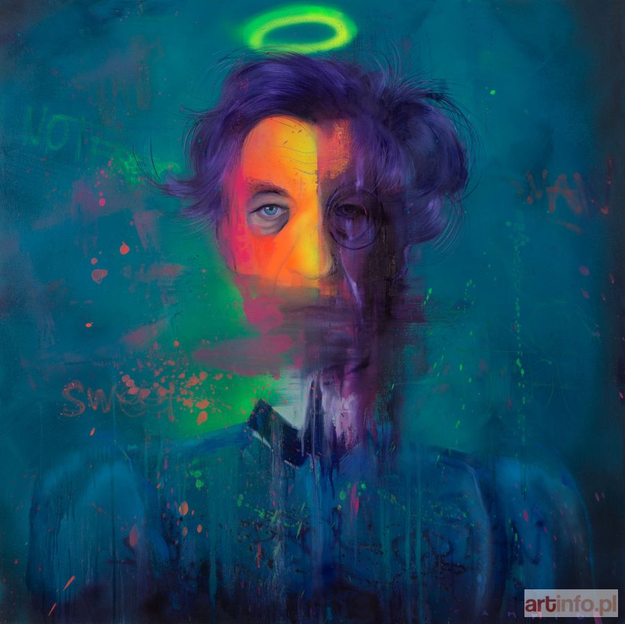 akryl, olej, spray/płótno, 120 x 120 cm sygnowany p.d.: 'CAMPIO' na odwrociu opisany: 'Campio | "NESTOR" | olej, akryl fluo, sprej 120 x 120 | 2019'