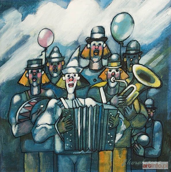 Artysta w prezentowanym płótnie sięga po chętnie podejmowany przez sztukę temat cyrku. To barwne widowisko, uderzające swą dziwnością i niezwykłością oddziałuje na wyobraźnię artystów. Rodem z tego surrealistycznego świata jest grupa grajków. Czerwone doczepiane nosy, kolorowe peruki i gruby makijaż wprowadzają nas w klimat żartu, niebezpiecznych wyczynów akrobatycznych i kuglarskich sztuczek, w świat, w którym nic nie jest tym, czym wydaje się być.