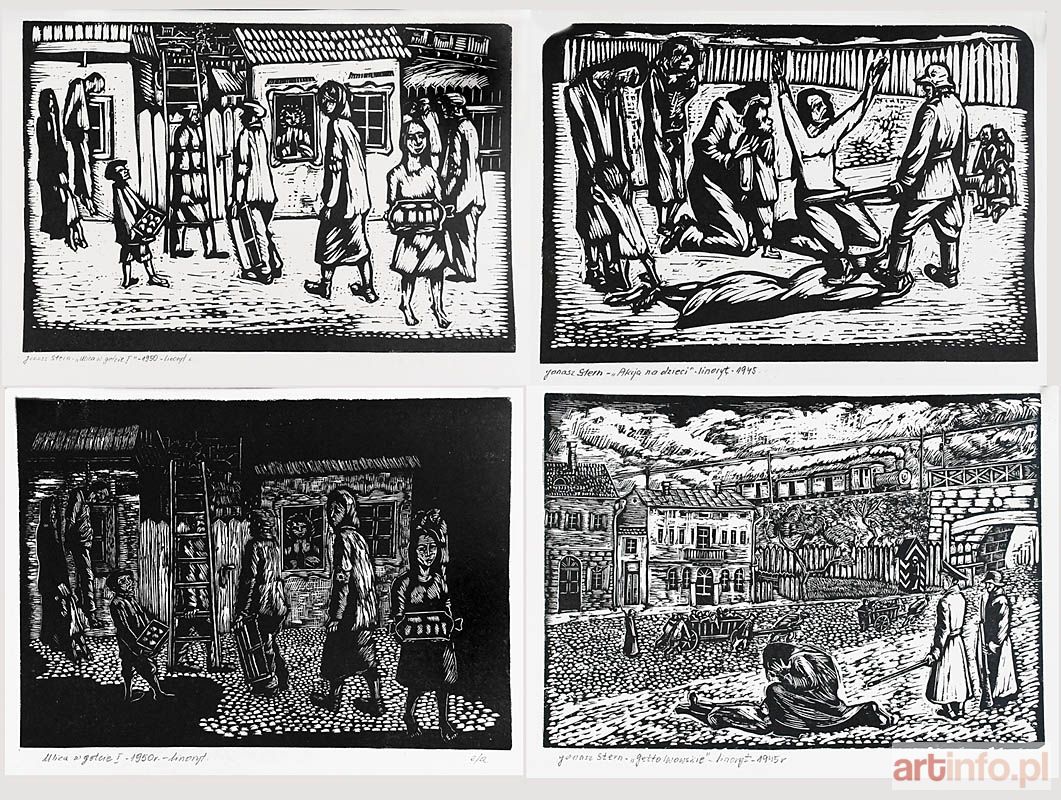 Tytuły prac: Kryjówka w getcie-1945, Brama do getta I-1948, Brama do getta II-1948 - 2 szt., Wysiedlenie III, Wysiedlenie II-1946, Uwięziona-1949, Getto lwowskie-1945, Ulica w getcie I-1950, Ulica w getcie II-1950, Akcja na dzieci-1945 oraz jeden linoryt niepodpisany.