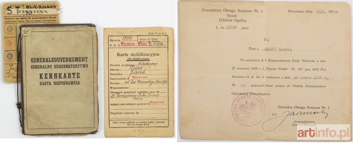 1. Świadectwo nadzwyczaj sumiennej, akuratnej i wydajnej pracy, umiejętnej i troskliwej opieki nad końmi, sprawności i dzielności, wielkiego poczucia obowiązku, prawości charakteru; wystawione przez dowódce baterii kapitana Rejnharda 2. Książeczka Wojskowa, wyst. Warszawa, 1924 3. Nadanie Medalu Dziesięciolecia Odzyskanej Niepodległości, 1930 4. Karta Mobilizacyjna do 21 Warszawskiego Pułku Piechoty 5. Kennkarte (Karta rozpoznawcza), wyst. Warszawa, 1943 6. Werk-ausweis (zezwolenie na pracę), wyst. Warszawa, 1943