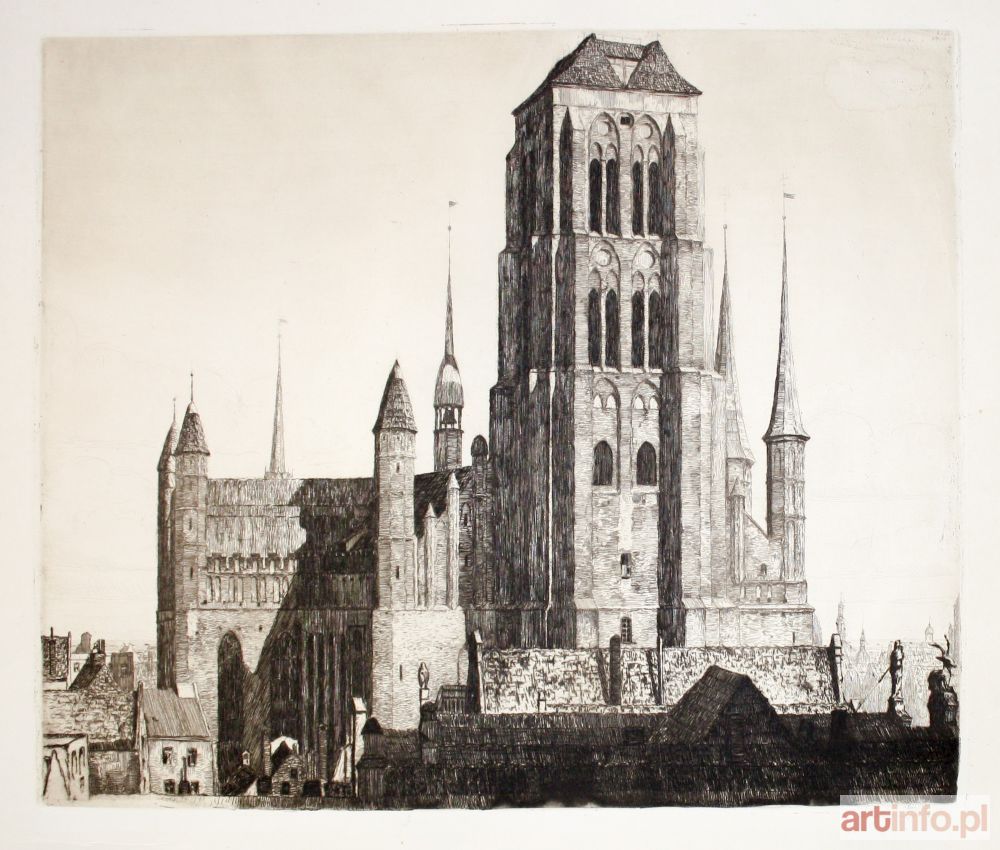 Bazylika Mariacka, rys. i lit. Berthold Hellingrath, Gdańsk, ok. 1930; w dole odręczna sygn. autora oraz opis: Danzig. Marienkirche Radierung um 1930; akwf. tonowana, st. bdb., na marginesach nieznaczne ślady wilgoci; wymiary płyty: ok. 510x430 mm; bez tyt.;