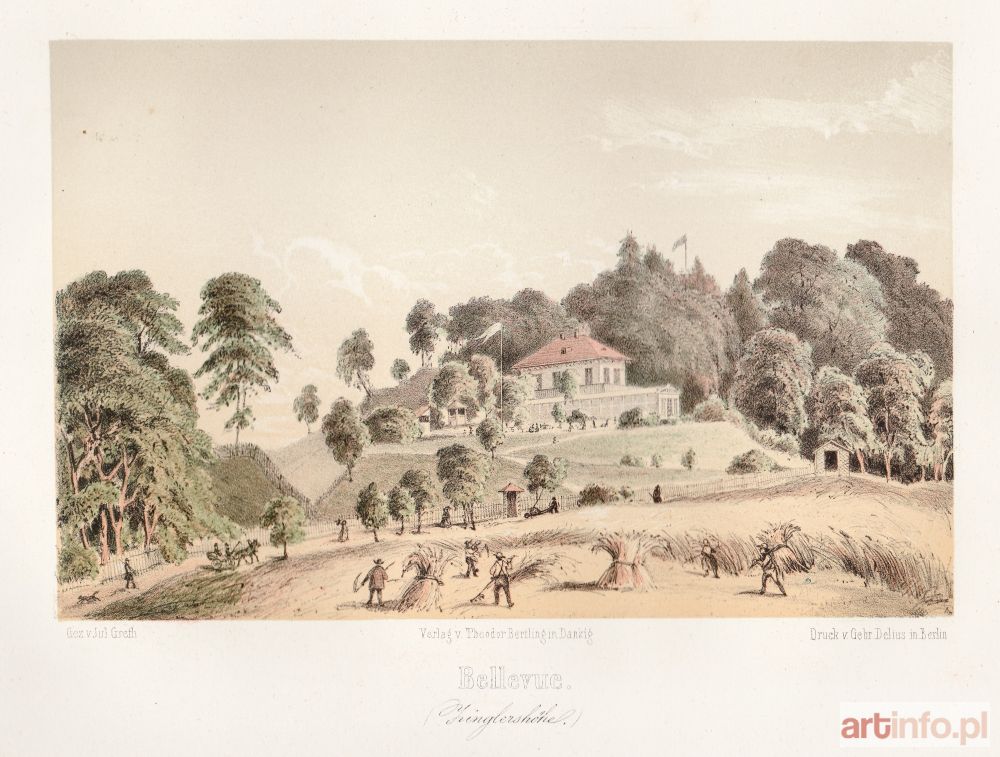 Widok na gospodę Bellvue, powszechnie nazywaną (podobnie jak całe wzgórze) Zinglershöhe, rys. i lit. Julius Greth, odbili bracia Delius w Berlinie, wyd. Theodor Bertling, Gdańsk, ok. 1860; chromolit., st. bdb., minimalne zażółcenia krawędzi; wymiary widoku: 196x126 mm; Bellevue. / (Zinglershöhe.); RZADKIE!