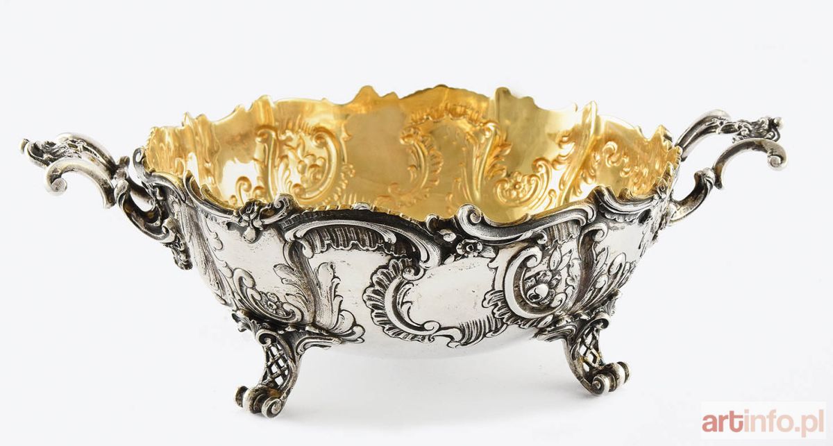 Na czterech ażurowych, wolutowych nóżkach z motywem skośnej kratki, kolista, dekorowana ornamentem rocaillowo-kwiatowym, ze złoconym wnętrzem (wtórnie), z nieregularnie wyciętą górną krawędzią; z boków 2 uchwyty skomponowane z ceowników i liści.
