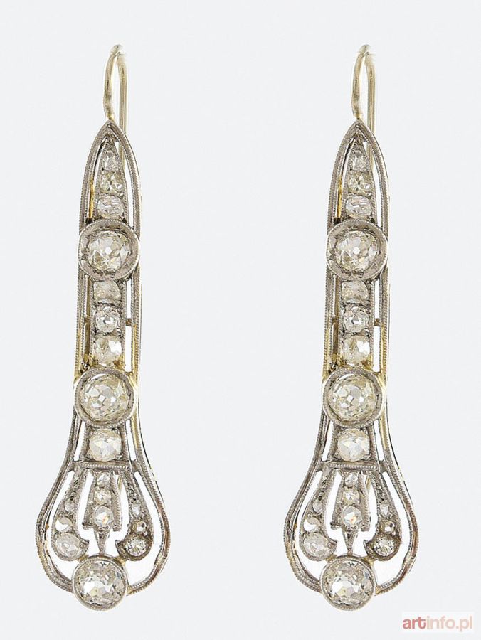 wiszące, ażurowane kompozycje wysadzane 32 szt rautów i rozet diamentowych o masie łącznej ok. 0.32 ct (Si-P2/G-K) oraz 6 szt diamentów w starym szlifie europejskim o masie łącznej ok. 0.88 ct (Si-P1/F-J),