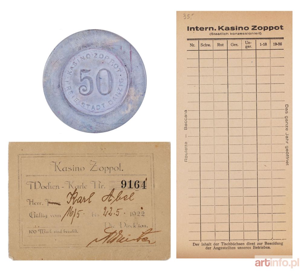 Kolekcja pamiątek z kasyna: bilet wstępu, blankiet oraz żeton o nominale 50