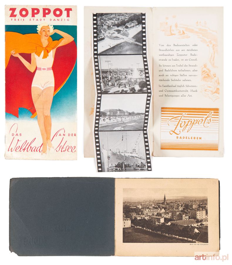 1. Folder reklamujący Sopot, 1936 r., druk Ottomar Steinbach, Gdańsk 2. Folder z widokami z uzdrowiska w Sopocie, 1. dekada XX w., wyd. Stengel & Co., Drezno, 16,5 x 23 cm