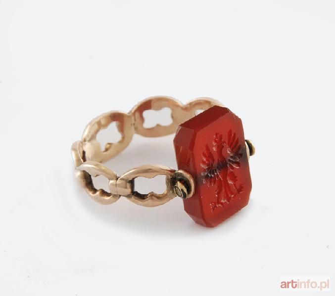 złoto, bursztyn (karneol?); oczko 1,5 x 1 cm, średnica 2,3 cm.
