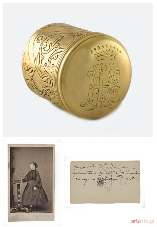 Wg sprzedającego pojemniczek należał do Marii z Hrabiów Krasińskich Raczyńskiej (1850-1884), córki pisarza Zygmunta Krasińskiego; dołączona fotografia tejże hrabianki wykonana w Paryżu w firmie Bingham w latach 60. XIX w.