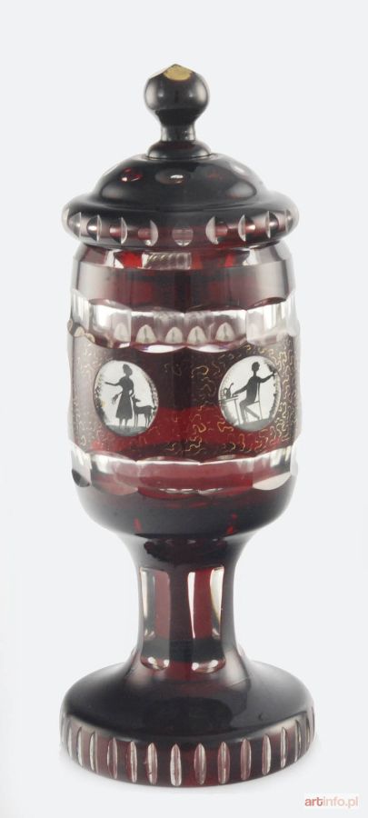 szkło przeźroczyste, fasetowane; lazura rubinowa, farby emaliowe, złocenie; wys. 22 cm, średnica 8,3 cm.