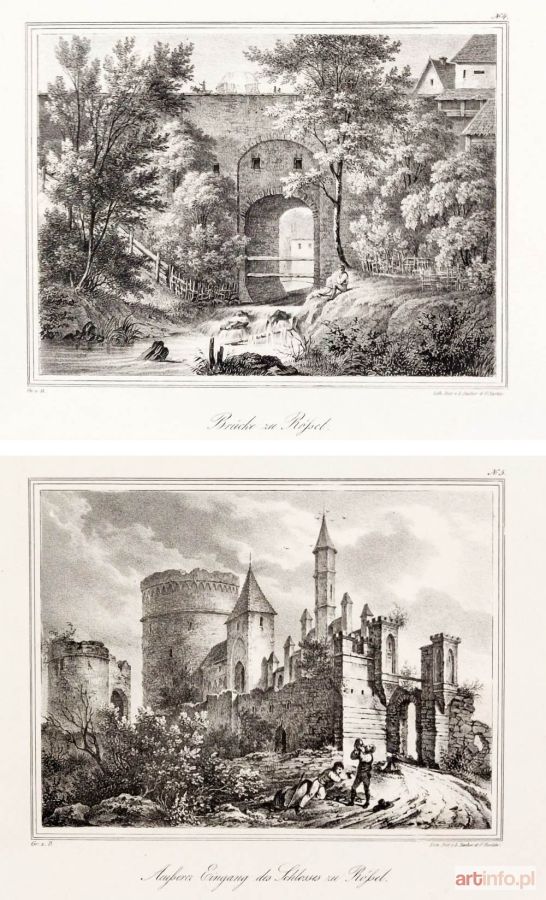 Zestaw 3 cz.-b. lit., rys. Gräfin zu Dohna, Lith. Inst. v. L. Sachse, pochodzi z: Johannes Voigt, Darstellungen alter preussischer Schlösser gezeichnet von Frau Gräfin zu Dohna, Berlin 1833; widoki przedstawiają: 1) most gotycki – Brücke zu Rössel; 2) widok zamku od str. północnej – Schloss zu Rössel; 3) widok zamku od str. zachodniej – Aeusserer Eingang des Schloss zu Rössel; wszystkie widoki w st. bdb.; wymiary widoków: 175x133 mm;