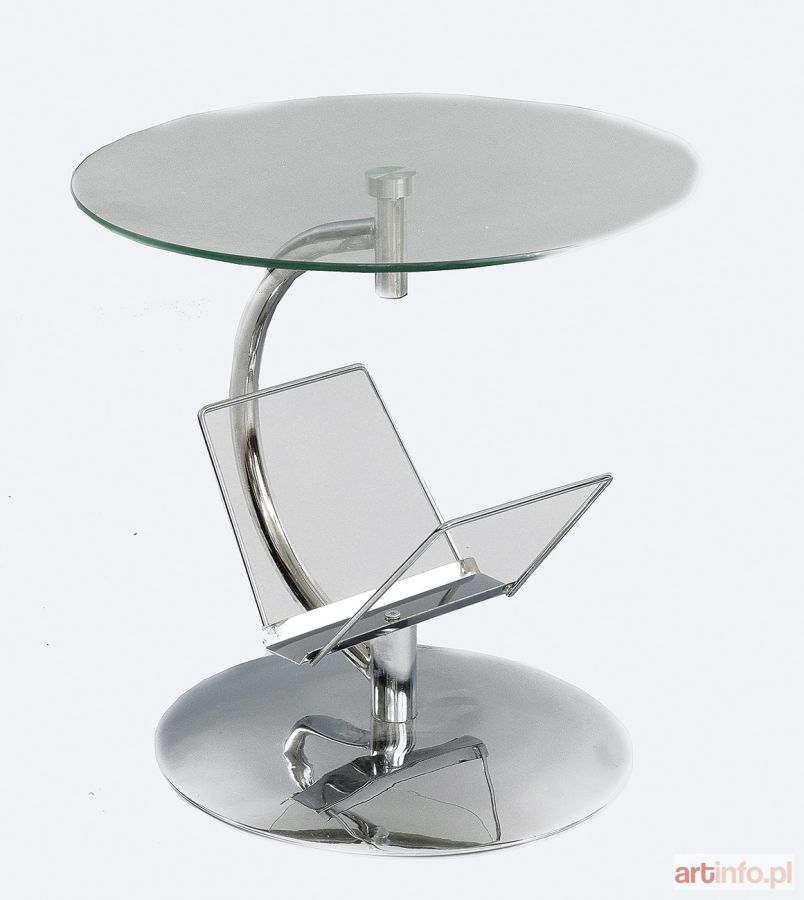 Stolik o konstrukcji ze stalowych rurek, z trzonem łukowatym tworzącym wsparcie dla okrągłego szklanego blatu, zamontowanym na talerzowatej podstawie z gazetnikiem w formie dwóch niewielkich ramek, odchylonych na boki i spiętych listwą u dołu.