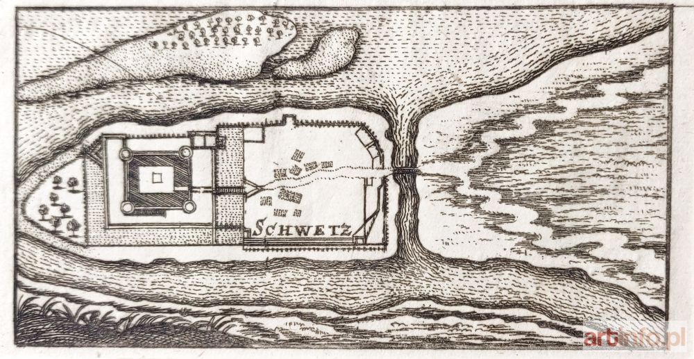 Plan zamku krzyżackiego, anonim, ok. 1650; miedz. cz.-b., st. bdb., passe-partout; wymiary planu: 112x58 mm; tyt. w obrębie planu, bez ramki: SCHWETZ; BARDZO RZADKIE!