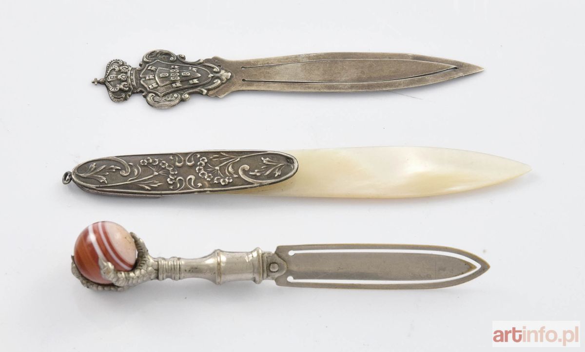 2/ lancetowata, z uchwytem ozdobionym kartuszem z herbem pod koroną; srebro niecechowane; dł. 10 cm