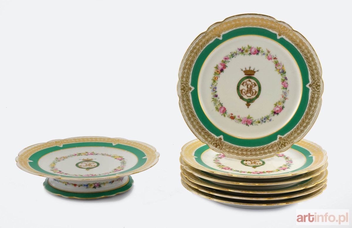 Talerzyki deserowe i paterka talerzowa na niskiej nóżce; 6-segmentowe kołnierze ze szlakiem złoconego ornamentu z plecionką i stylizowanymi palmetami przy krawędziach oraz szmaragdowo- zielonym szlakiem; w lustrach krąg drobnych kwiatów z malinowymi różyczkami i złocony kaligraficzny monogram wiązany ZH lub HZ w kręgu zielonej taśmy, pod 5-pałkową koroną szlachecką (wicehrabiowską); wokół niskiej stopki paterki szlak zielonej taśmy i drobnych kwiatków. Dekoracja w stylu wyrobów manufaktury Sévres z końca XVIII wieku, wykonana najpewniej w którejś z XIX-wiecznych paryskich wytwórni małych uliczek.