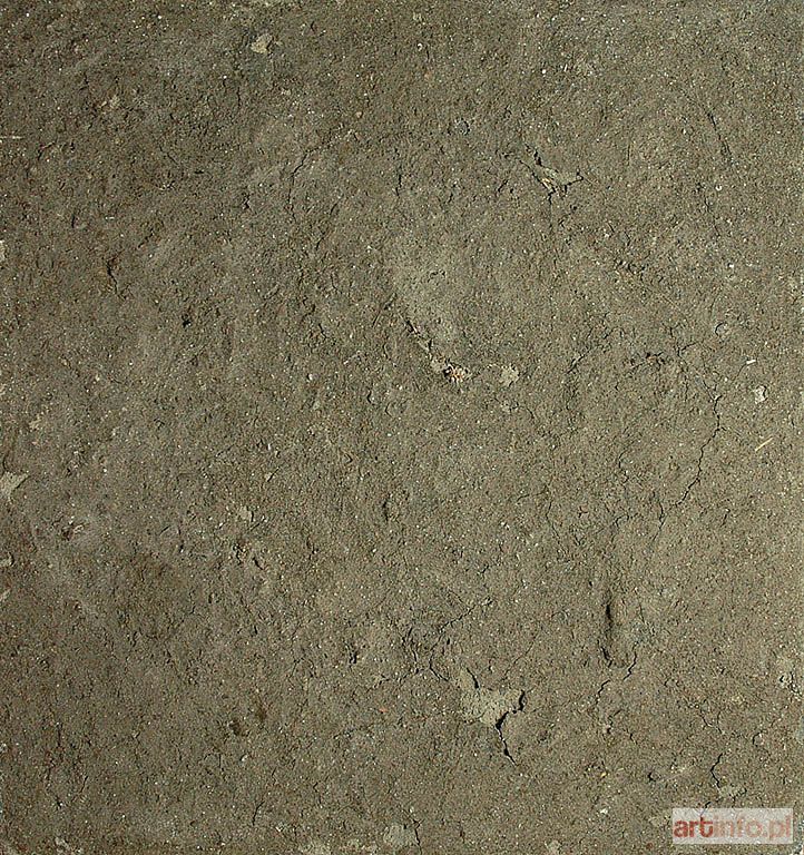 ziemia o różnych barwach, żwir, piasek, kamienie, kawałki roślin, czarna farba płótno 90 x 100 cm, sygn.: na odwrocie