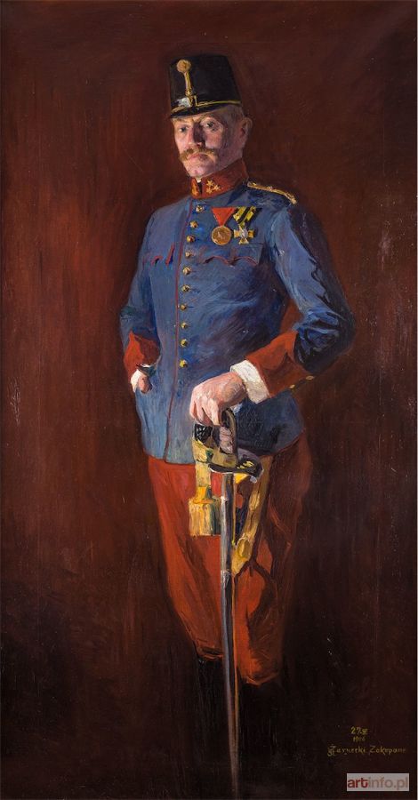 olej, płótno, 140 x 74,5 cm; sygn. i dat. p. d.: 27. III/1906 STŻarnecki - Zakopane; na krośnie nalepka wystawowa TPSP w Krakowie z 1906 roku z numerem 1042 i tytułem "Portret rotmistrza"