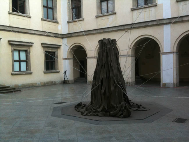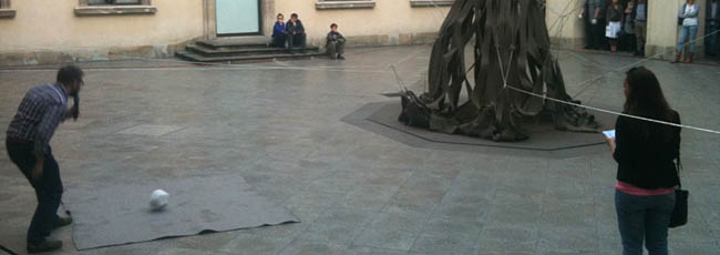 Wernisaż na dziedzińcu CSW rozpoczął live performance artysty i architekta Jakuba Szczęsnego, podczas którego grupa uczestników (dwanaście dwuosobowych zespołów) wzięła udział w budowie Rozciąganego pawilonu. Instalację tworzyło kilka związanych u góry i umocowanych u dołu płacht wykonanych z materiału concrete canvas. Powstałą w wyniku naciągania lin konstrukcję zalano następnie wodą w celu jej usztywnienia (pawilon-rzeźbę można oglądać w parku CSW).