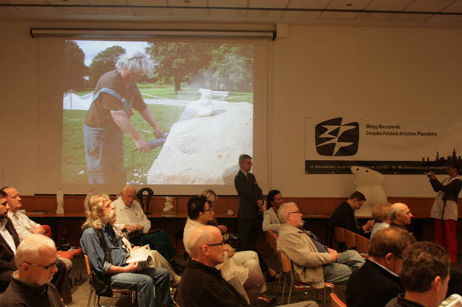 Spotkanie pod hasłem „W pół drogi” odbyło się równo na półmetku działań artystycznych i było doskonałą okazją do pierwszych podsumowań. Zaproszeni goście obejrzeli krótki film oraz pokaz zdjęć z ostatnich dwóch tygodni pleneru, makiety prac realizowanych na Polu Mokotowskim, a także małe formy rzeźbiarskie twórców biorących udział w projekcie. Można było również porozmawiać z artystami o ich pracy.