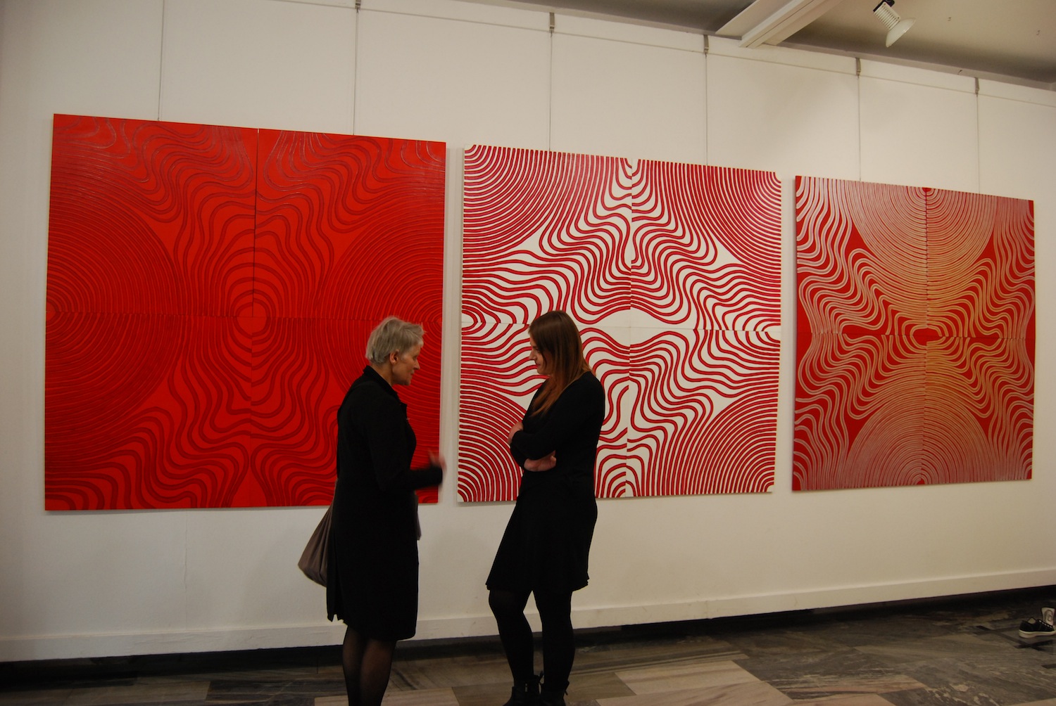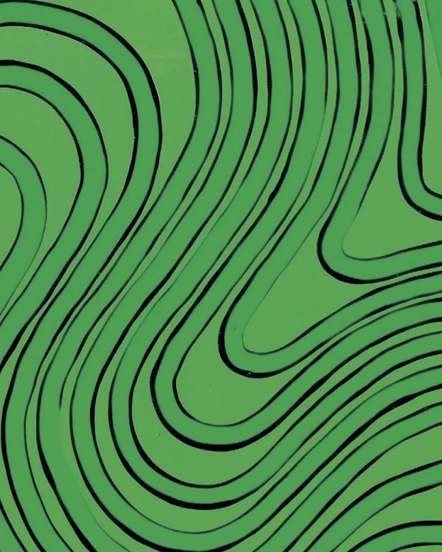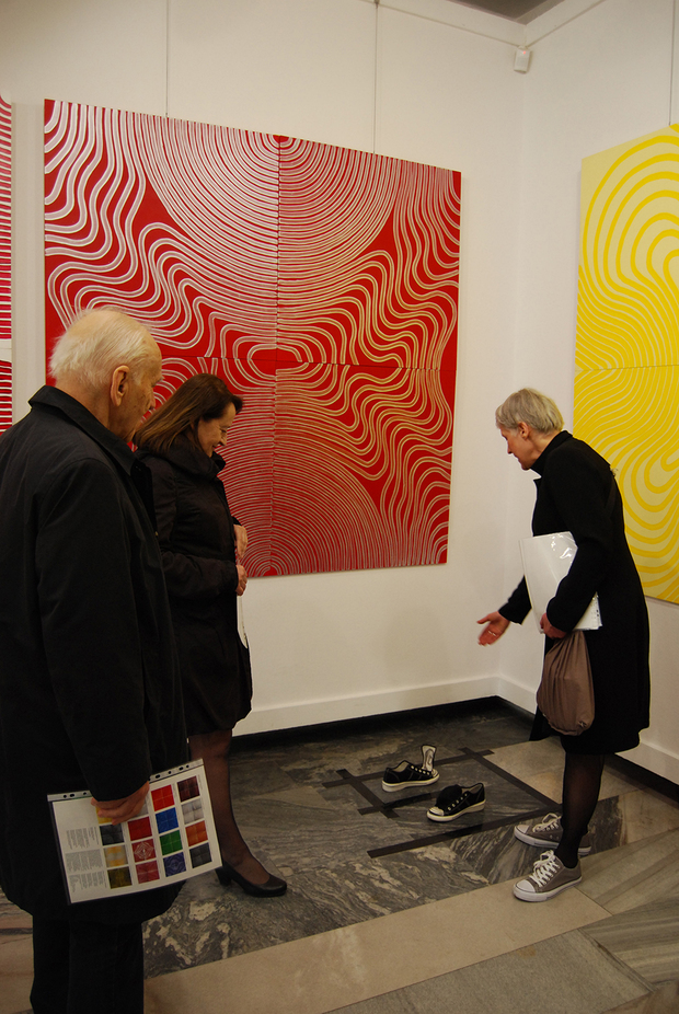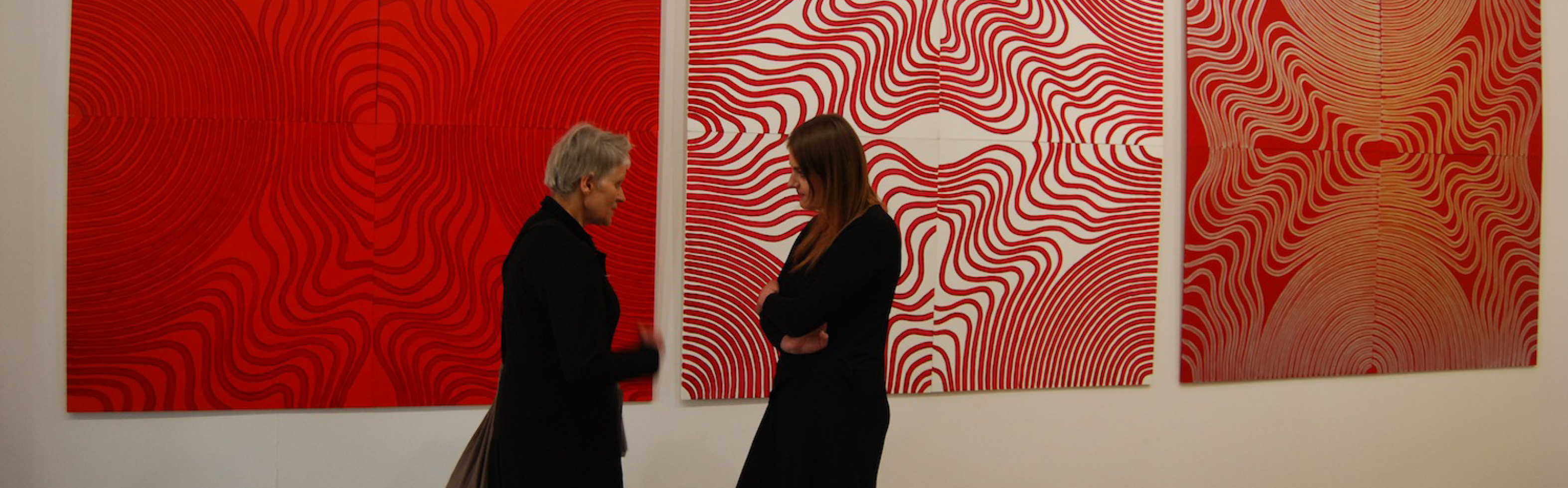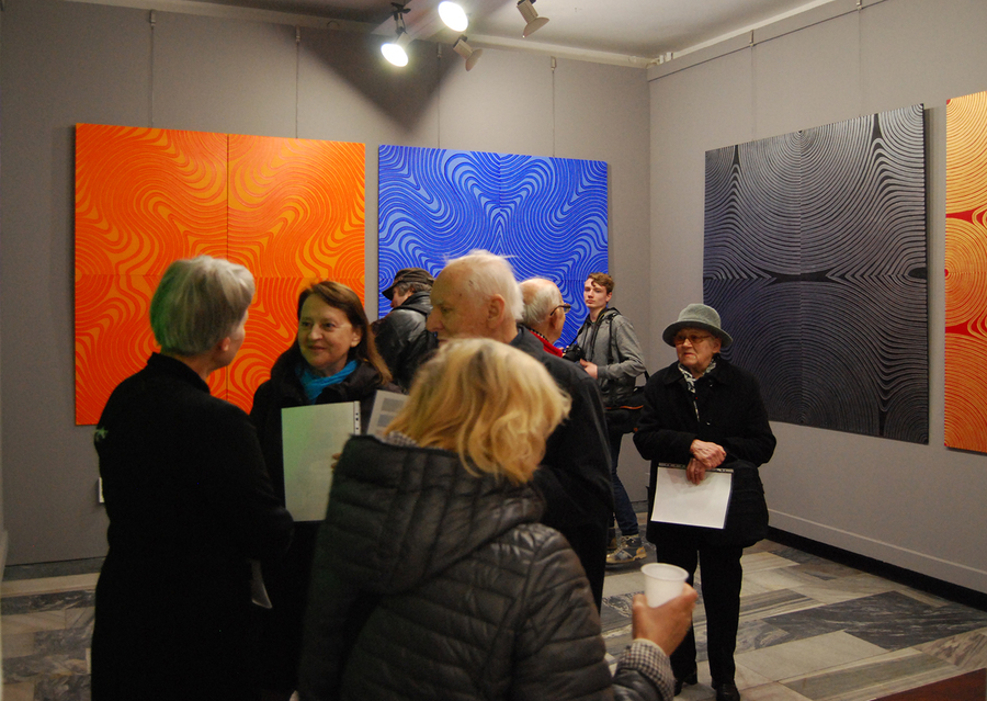 Prace Ewy Markiewicz-Adamczewskiej to seria geometrycznych obrazów wykonanych w technice akrylu na drewnianej płycie-sklejce, utrzymanych w duchu abstrakcji. Prace artystki są syntetycznymi formami, pozbawionymi zbędnych upiększeń i egzaltacji. Charakteryzuje je przejrzysta kompozycja, ograniczona paleta barwna. Jednak nie pozbawione są one rytmiki i harmonii. Przyglądając się pracom autorki, można odnieść wrażenie, że są one czymś w rodzaju zabawy z linią, zabawy, która łagodnie wprowadza odbiorcę w świat sztuki współczesnej, dając możliwość do- strzeżenia piękna w najprostszych elemen- tach kompozycji plastycznych. Oglądając prezentowane obrazy możemy dostrzec, jakie możliwości wyrazowe daje linia, która przybiera tutaj formę spirali, formę, która niezwykle często występuje w świecie przyrody, np. kształt galaktyk, spiralnie układające się płatki szyszki sosny, układ liści na łodygach roślin, budowa muszli, itp. W aspekcie matematycznym spirala posiada cechę nieskończoności i właśnie z tego względu występuje w mitach i wierzeniach całego świata. Sama forma spirali ma charakter ponad kulturowy, archetypiczny. Odzwierciedla obraz jedności w konflikcie przeciwieństw i wiecznych przemian: początek-nieskończoność, ruch-bezruch, przestrzeń-płaskość, światło-mrok, próżnia- materia, jest łącznikiem świata wewnętrz- nego z zewnętrznym, oznacza walkę żywiołów i transgresję. Spirala jest również metaforą dążenia do samodoskonalenia, głębokiej transformacji wewnętrznej.