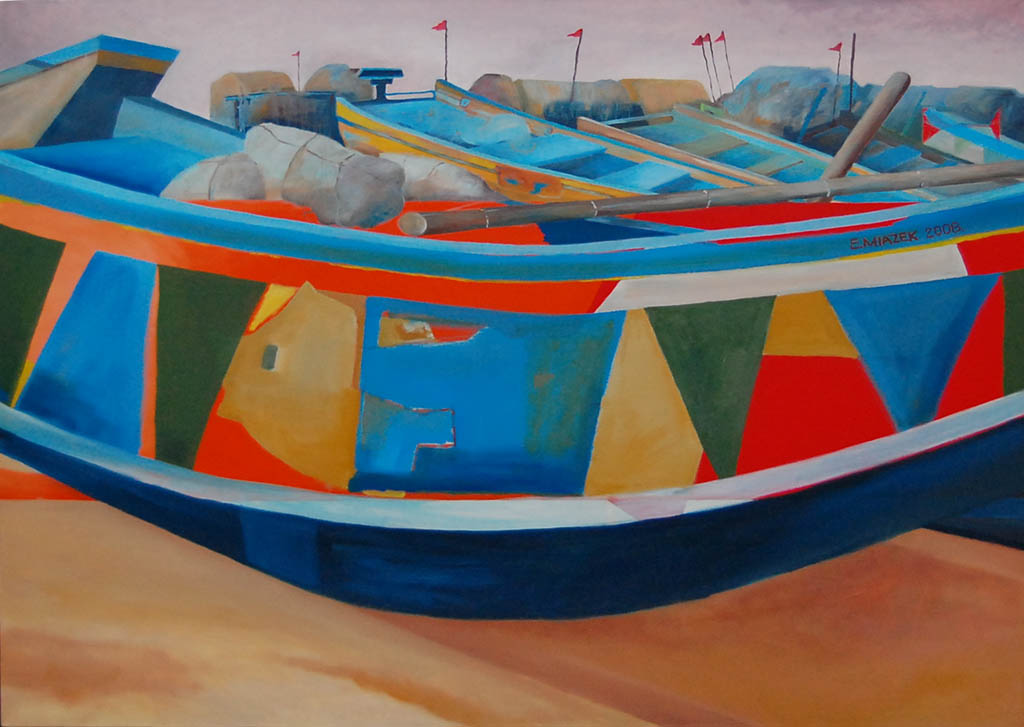 Wrażenia ze swoich podróży do Indii, gdzie była trzykrotnie, Ewa miazek notuje w formie obrazów będącymi zapisem konkretnych miejsc i chwil tam spędzonych. Plaża, łodzie na niej, czy też nie do końca realistycznie potraktowane budowle z jej płócien są wynikiem obserwacji i inspiracji jakie odnaleźć można w tym różnorodnym i zupełnie odmiennym od naszych europejskich przyzwyczajeń kraju.