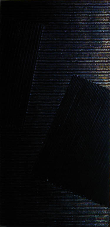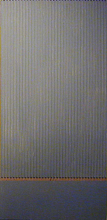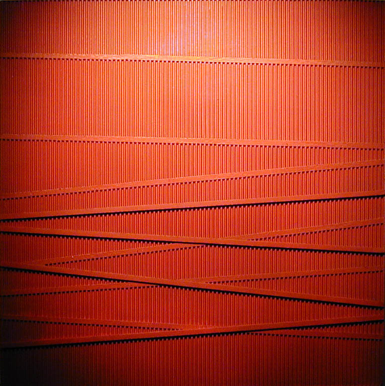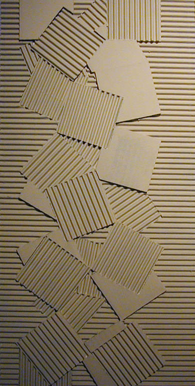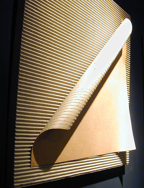 Grażyna Bartnik zajęła się nobilitacją jednego z najbardziej podłych materiałów - kartonu. Takiego kartonu, z jakiego robi się pudła do pakowania. Dwie karty sztywnego papieru, a pomiędzy nimi karbowane, delikatne rureczki wypełnione powietrzem. Po rozcięciu to bogactwo faktury i światłocieniowych efektów. Nieograniczone możliwości.