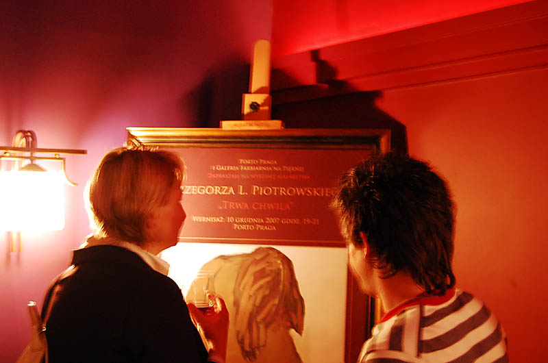 Mariaż gastronomii i sztuki, zwłaszcza nowoczesnej, bywa ryzykowny, zresztą dla obu stron. Rzadko służy artyści, który w pogoni za klientem ostatecznie czuje się jak zmuszony do "gry do kotleta", z drugiej strony restauratorzy zwykle mają poczucie, że wiele z wystawami kłopotów, a wnętrze nie przygotowane do funkcjonowania ze sztuką staje się wizualnie rozbite. Także bywalcy lokalu nie zawsze wykazują zrozumienie dla prezentowanych wystaw, poczytując je za mniej lub bardziej udaną dekorację. W przypadku Porto Praga jest chyba inaczej. Podział przestrzeni na "dekoracyjną" i wystawową jest wyraźny, a rozplanowanie przestrzeni stwarza gościom dogodny punkt obserwacyjny wystawy. Malarstwo Piotrowskiego, nowoczesne w formie, stanowi silny kontrapunkt dla wystroju, postuluje dla siebie uwagę, jest nieschlebiające potocznym gustom i poprzez swój oryginalny charakter nie musi się we wnętrzu bronić, a harmonijnie w nim koegzystuje. Goście Porto Praga to elitarna, wyrobiona grupa koneserów nie tylko kulinarnych, dla których obcowanie ze sztuka jest nawykiem, a nie egzotyką, stąd przygotowywanie dla nich wystaw ma sens i nie jest "pustym" działaniem, zwłaszcza, kiedy odczynienia mamy po prostu z dobrą wystawą, tak jak w tym przypadku. Malarstwo Piotrowskiego uderza silną emocjonalnością, nie tracąc przy tym walorów estetycznych. Jego cechy charakterystyczne - odważne operowanie kontrastem i płasko kładzioną farbę, obecne także w najnowszym cyklu prac artysty, silnie oddziałują we oprawie czerwieni ścian Porto Praga. Wystawy w Porto Praga kuratorowane są z ramienia warszawskiej galerii Farbiarnia na Pięknej.