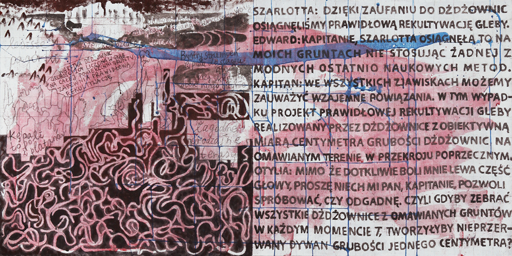 Jak zwykle obrazy Marka Sobczyka mówią i choć czasem są to rozwlekłe monologi, czasem lapidarne hasła - zawsze trafiają w sedno. Mówią też dosłownie - zapisanym na płótnie tekstem i znakiem, rozpoznawalną przez widza formą i kolorem. Są dla widza jak rebus do rozszyfrowania. Zatem obejrzyjmy wystawę i odgadnijmy hasło ukryte w obrazach.