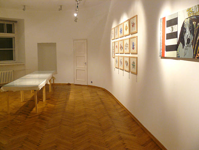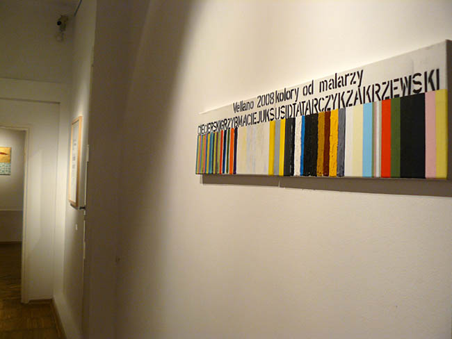 Pejzaż Toskanii, a dokłądnie miasteczka Vellano, dostarczał bodźców artystom do pracy. Powstały zatem tytułowe „obrazy-obrusy” będące autorską interpretacją toskańskiego pejzażu. Rzeczony obrus pojawia się też w przestrzeni ekspozycji, pokryty, nie inaczej, rysunkami - radosną twórczością Włodzimierza Jana Zakrzewskiego. I jeśli by szukać wspólnego mianownika prezentowanych prac, to jest nią wyraźnie wyczuwalna radość tworzenia płynąca ze wspólnego przebywania – rozmowów, dyskusji. Pokazuje to film autorstwa Pawała Susida, dokumentujący zabawne rozmowy twórców luźno związane ze sztuką na tarasie domu w Vellano. A jak powszechnie wiadomo twórcze jest niejednokrotnie dobre towarzystwo w jakim się znajadujemy. W każdym razie artyści, czują się ze sobą znakomicie, co widać na filmie Susida.