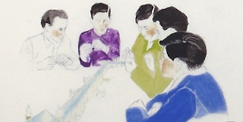 Dwa pastele poznańskiej artystki, pochodzące z 2006 roku, znakomicie puentują ideę naszej wystawy. Topos Budowania Nowego Domu i topos Nowego Człowieka, tak żywotne w tradycji lewicy, w wielowymiarowej przestrzeni Szwed zyskują swoiste znaczenia - oto pięciu Hiramów konstruuje molo, dom na wodzie, a sama idea budowania sprzężona jest nierozłącznie z Nowym Człowiekiem.