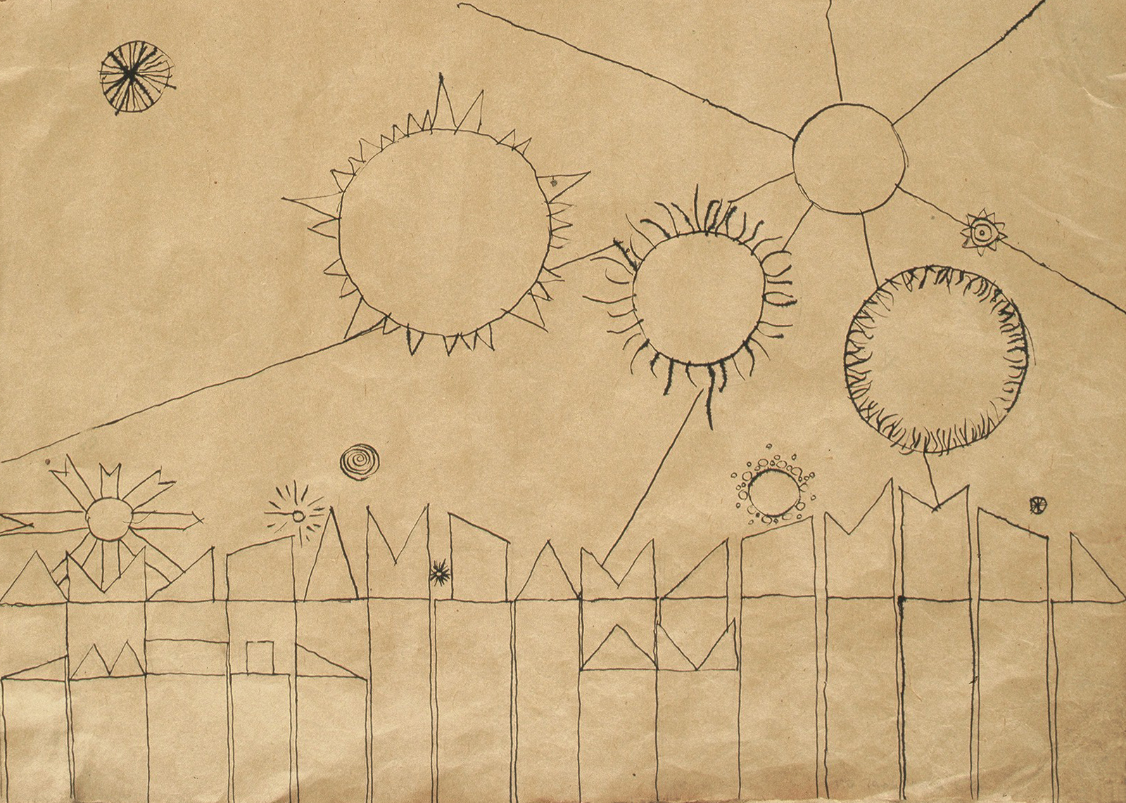 Trzy rysunki tuszem na papierze pakowym przedstawiające Nieba nad Miastem, reprezentują ideę nowego stworzenia świata. Dwa mają tytuły autorskie: Zachód i Katastrofa. Wystawiane na I Wystawie Sztuki Nowoczesnej w Krakowie w 1948 roku. Utwory wolnomyśliciela, który niósł światu orędzie pokoju.
