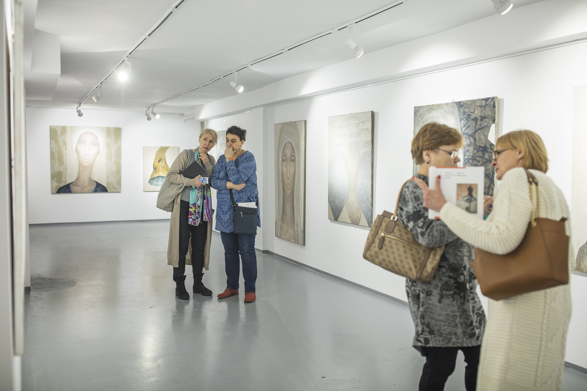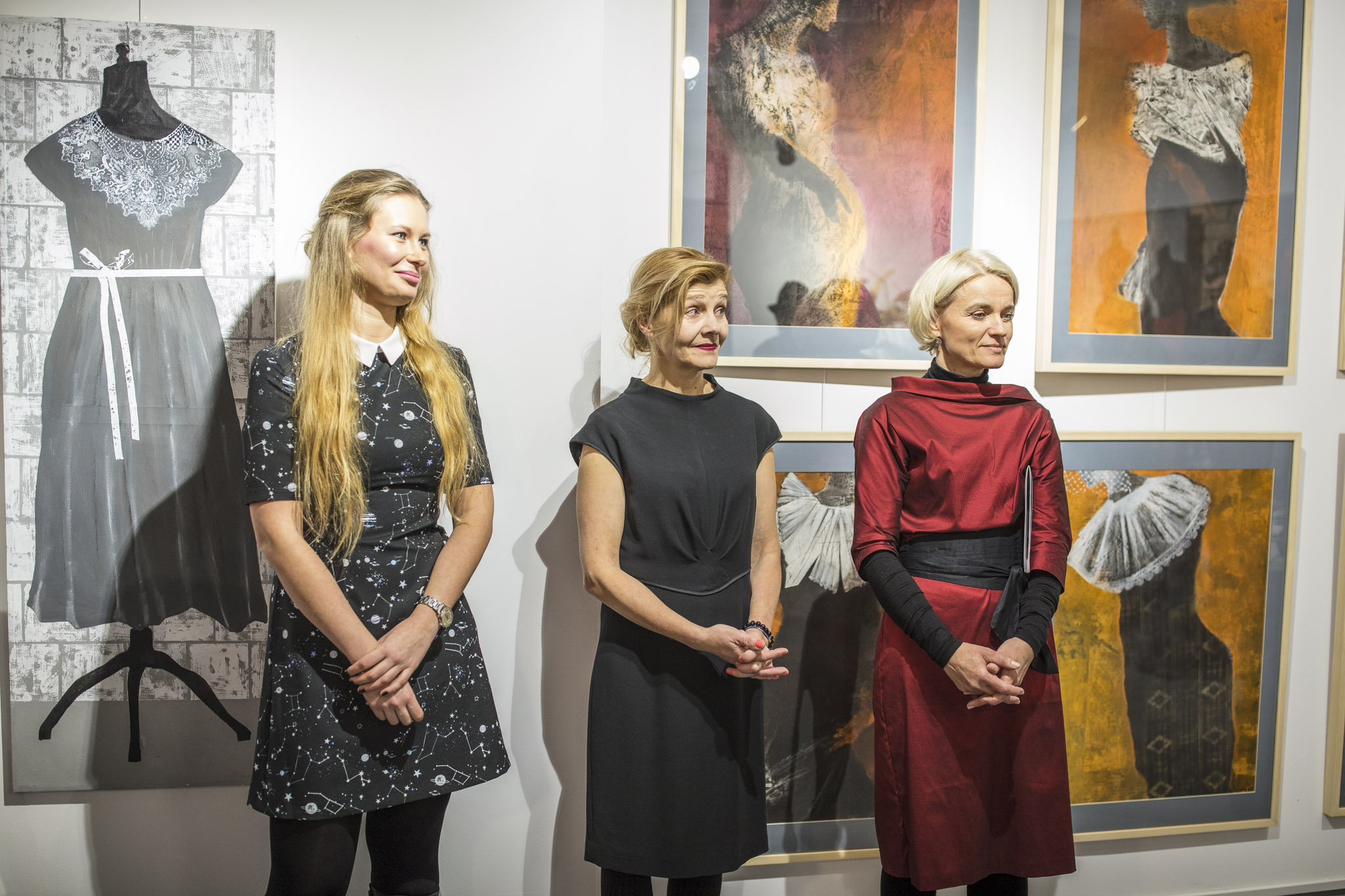 Prace Uli Niemirskiej to przede wszystkim złożone, nierzadko lekko dowcipne kolaże opowiadające o napięciach w ciele, umyśle i duszy człowieka, a także o bardzo intymnej stronie kobiecości. Artystka niezwykle swobodnie gra skojarzeniami i subtelnymi aluzjami, wykorzystując przy tym cały wachlarz technik artystycznych. Agata Rościecha sięga do nieco zawoalowanej strony kobiecości kojarzącej się z tajemnicą i elegancją. Podejmuje problematykę atrybutów płci pięknej: ukazuje elementy garderoby - gorsety, wstążki, koronki i wytwornie ubrane kobiece postaci. Rościecha nie portretuje jednak ciała i fizyczności, jej sylwetki odwołują się do postaci kobiecych symbolicznie, głównie poprzez teatralne manekiny. Na wystawie można zobaczyć również mistrzowskie pastele autorki. Ekspozycja Izy Staręgi złożona jest z dwóch cykli - organicznych, nieco surrealistycznych abstrakcji, oraz portretów z serii Kobiety w chustach, mężczyźni w hełmach. Malarstwo Staręgi, bez względu na to, który wątek prezentuje, przede wszystkim jest opowieścią o kolorze. Delikatne zestrojenia barw, znamionujące wyjątkową wrażliwość artystki na ten aspekt malarstwa, pokazują jej wirtuozerię.