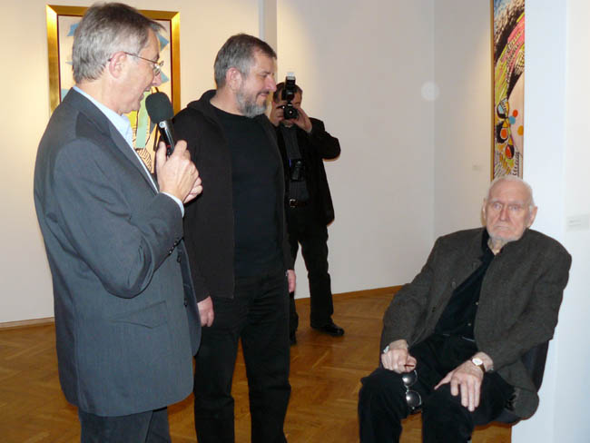 W pracach prezentowanych w aTak najważniejszy jest rysunek – w przeciwieństwie do bardzo malarskich, rozedrganych fal i kręgów Fangora z lat 60. Jest to kreska, dobrze znana z wczesnych dzieł artysty – miękka i płynna. Barwy natomiast są niejako dopełnieniem rysunku, choć w znaczący sposób wpływają na odbiór całości. Co ciekawe prace te powstawały etapami, tj. rysunek był wcześniejszy, natomiast nałożenie warstwy malarskiej dokonało się później. Interesująca jest też technika wykonania obazów – Fangor wcześniejsze rysunki naniósł na płótno jako wydruk komputerowy, a następnie nałożył farby olejne oraz wkleił geometryczne figury kolorów. Do tego działania odnosi się tytuł wystawy Palimpsest. Jak mówi encyklopedia palimpsest to „rękopis spisany na używanym już wcześniej materiale piśmiennym, z którego usunięto poprzedni tekst”. Fangor na wcześniejsze rysunki naniósł nowy, malarski strój, a efektem tego zabiegu jest zupełnie inny odbiór poprzednio stworzonych rysunków. Jak widać z prezentowanych prac twórca mistrzowsko opanował zarówno warsztat rysunkowy jak i malarski, choć tutaj kolor został podporządkowany kresce.