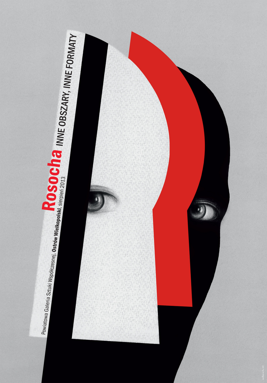 Decyzją Jury Złoty Medal trafi do Wiesława Rosochy za plakat towarzyszący własnej wystawie artysty w Powiatowej Galerii Sztuki Współczesnej w Ostrowie Wielkopolskim. Projekt niesie bardzo silny przekaz dotyczący zarówno twórczości Rosochy, jak i zjawiska plakatu. Warstwowo zarysowane sylwetki sugerują na przykład seryjność, która cechuje to medium, a zwrócenie uwagi widza na oczy podkreśla znaczenie zmysłu wzroku. Rosocha robi ewidentny ukłon w stronę modernistycznej awangardy, ale równocześnie wyznacza nowy, subtelny ton za sprawą zabiegu użytego wobec faktury oraz sposobu, w jaki nakreślono oczy. Kształt głowy wraz z czcionką tworzą piękną kompozycję.