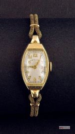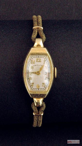 w złotej, beczułkowej kopercie, na brązowym pasku z dwu plecionek; tarcza srebrzona, matowiona, z nakładanymi złotymi cyframi arabskimi, ozn. na tarczy: HAMILTON, szybka soczewkowa; mechanizm z naciągiem ręcznym, 17 kamieni, ozn.: HAMILTON U.S.A. / 17 JEWELS, nr 721; ozn. na wewnętrznej stronie koperty: HAMILTON WATCH Co. / 14K GOLD / LANCASTER PA. / K 195571; ozn. na zewnętrznej stronie koperty: HAMILTON 14K / GOLD; ozn. na zapięciach paska: MADE IN USA / PAT. 2131454