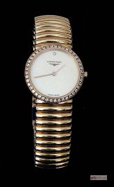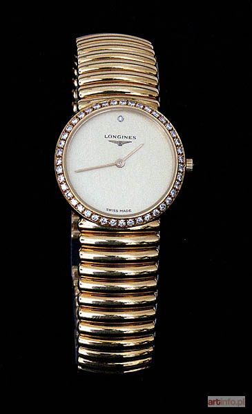 ze złotą kopertą i złotą bransoletką firmową, dekorowany 43 brylancikami, z napisem na tarczy: LONGINES / SWISS MADE; nr 5952.32, nr ref. L. 153.2;