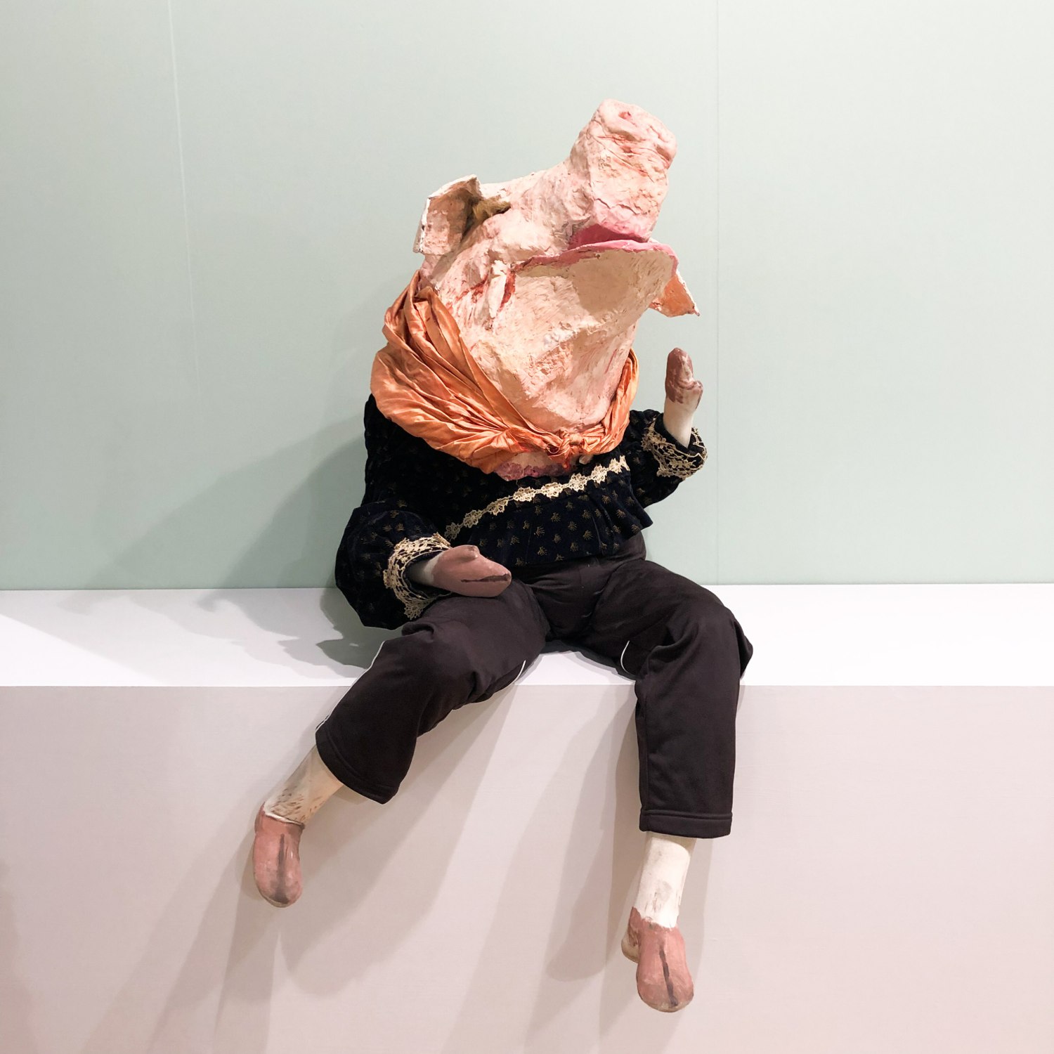 Od pewnego czasu zastanawiałam się dlaczego w twórczości artystów młodszego pokolenia tak ważnym motywem staje się maska. Wydaje mi się, że jest to wyraz tej ucieczki od prawdziwego wizerunku. Wymogu społecznego odnośnie naszego wystylizowanego, szczęśliwego i idealnego życia, który następnie obwieszczamy na mediach społecznościowych (gdzie przecież również jesteśmy jak te produkty na półce sklepowej - towarzyszy nam zachęcający komentarz a nasz wizerunek jest podrasowany przez jedną z miliona aplikacji, aby wyróżnić się i być atrakcyjniejszym). Czy już nie chcemy być sobą? Czy ważne jest jedynie co się ma i kim to nas czyni? Oto kilka pytań, które pozostały mi w głowie po tegorocznych targach Art Basel.